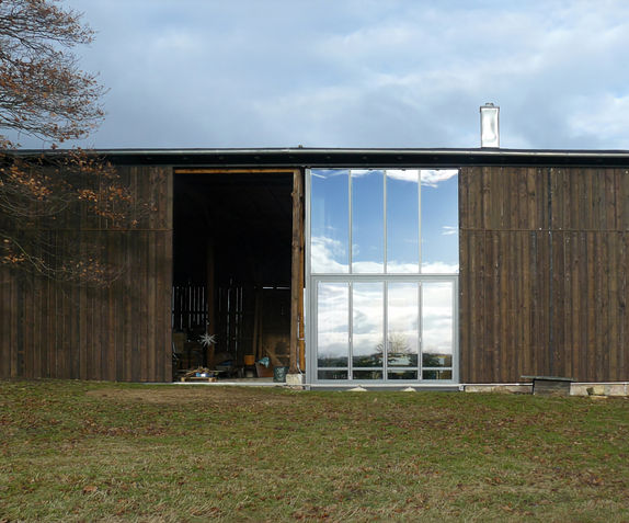 Die Scheune mitten auf einer Kuhwiese beherbergt Haus und Werkstatt. Dafür wurde einfach ein transparenter Kubus in das alte Bauwerk integriert.